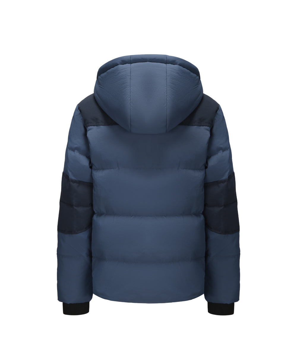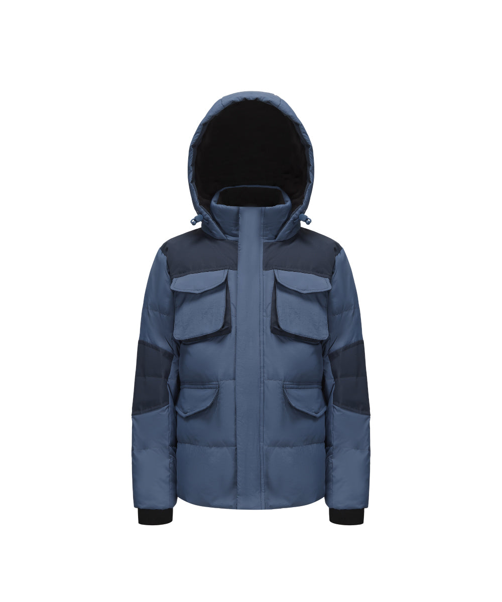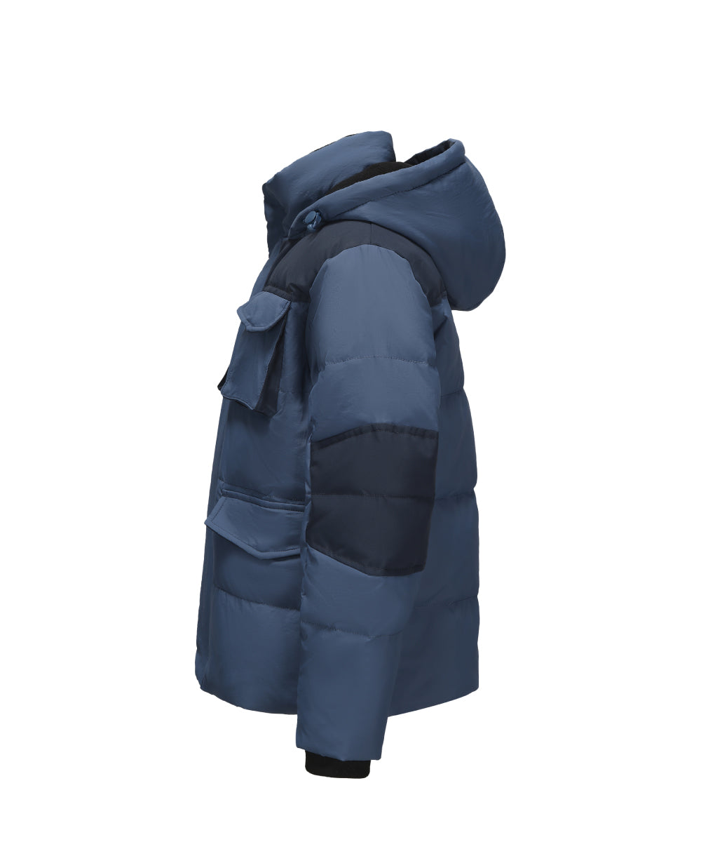 Boy’S Down Jacket With Dual-Tone Panel Design, Featuring Multiple Flap Pockets, Full Zip Closure For Warmth And Style.