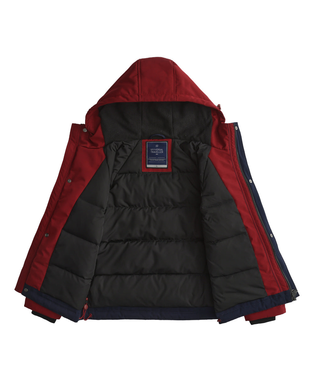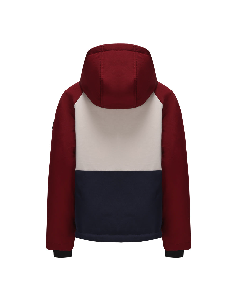 Color-Blocked Boy’s Down Jacket Featuring A Modern Three-Tone Design In Maroon, Navy, And Light Khaki. Warm, Lightweight, And Stylish With A Protective Hood And Practical Pockets—Ideal For Winter Wear.