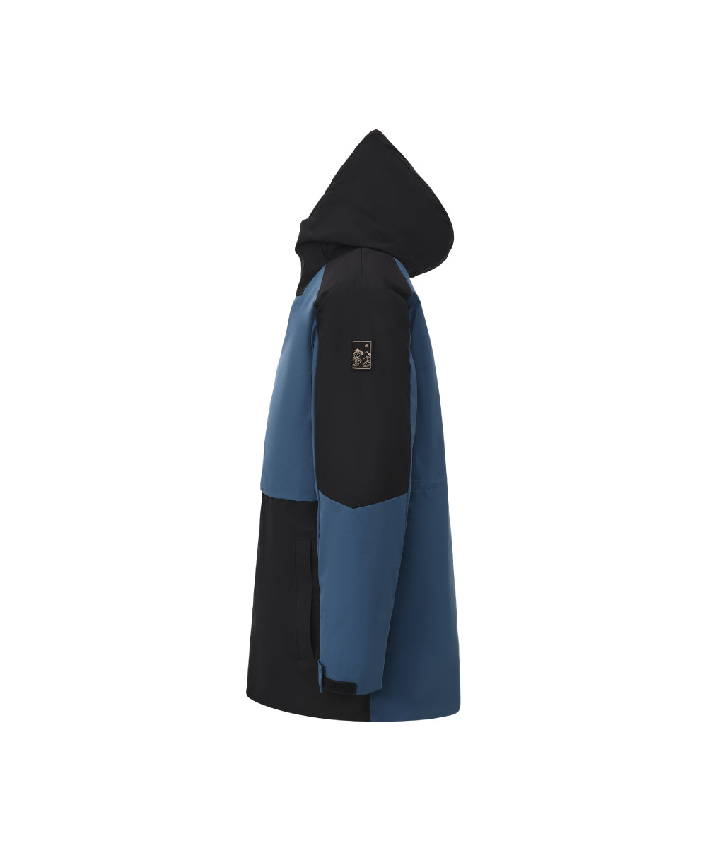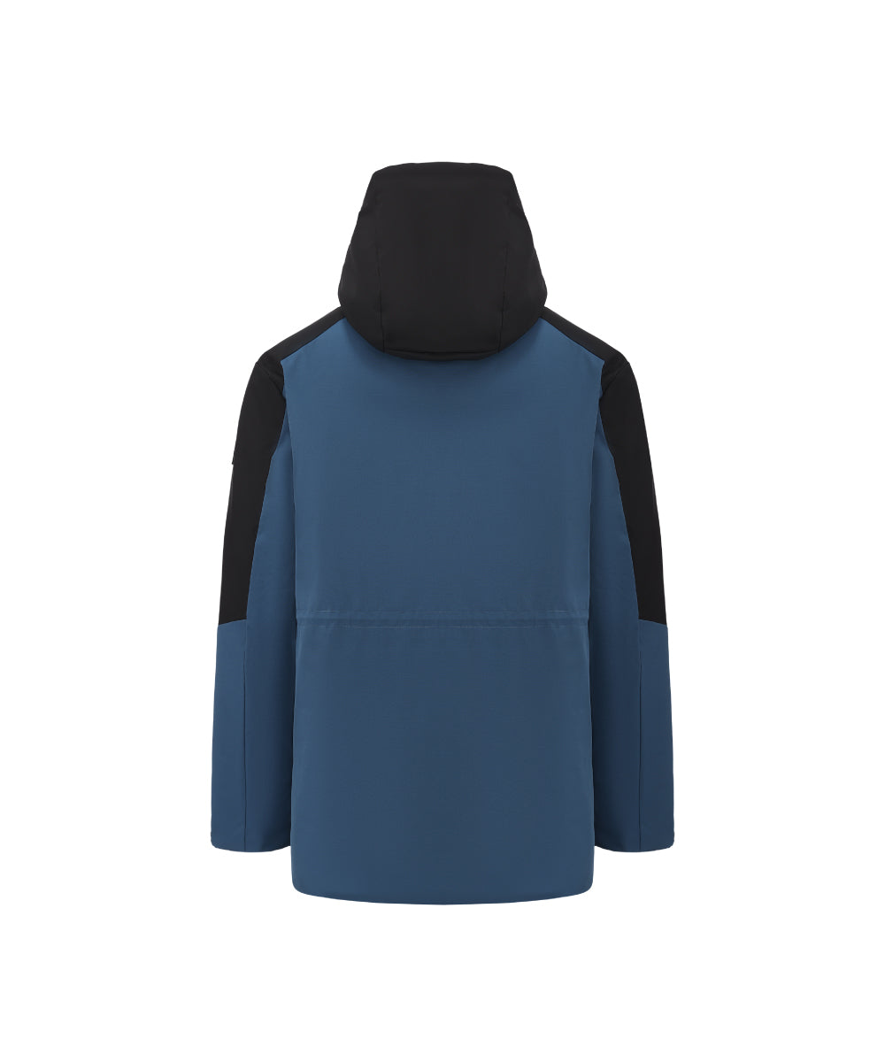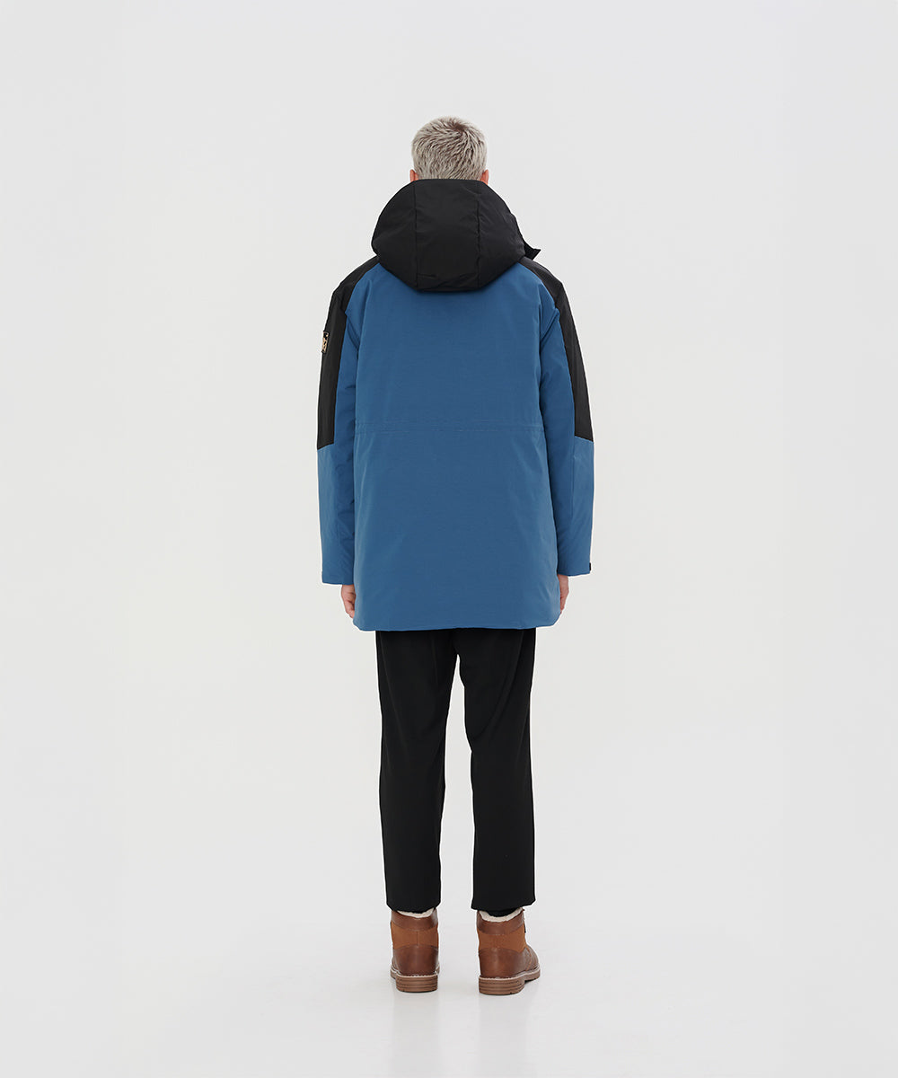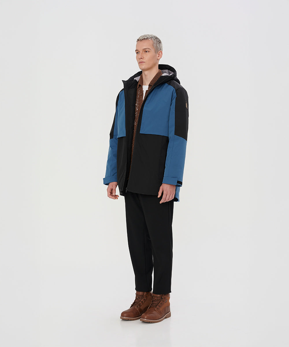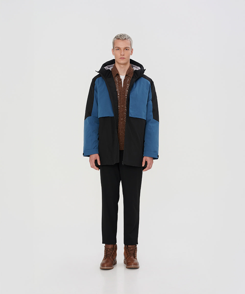 A modern two-tone down jacket crafted from