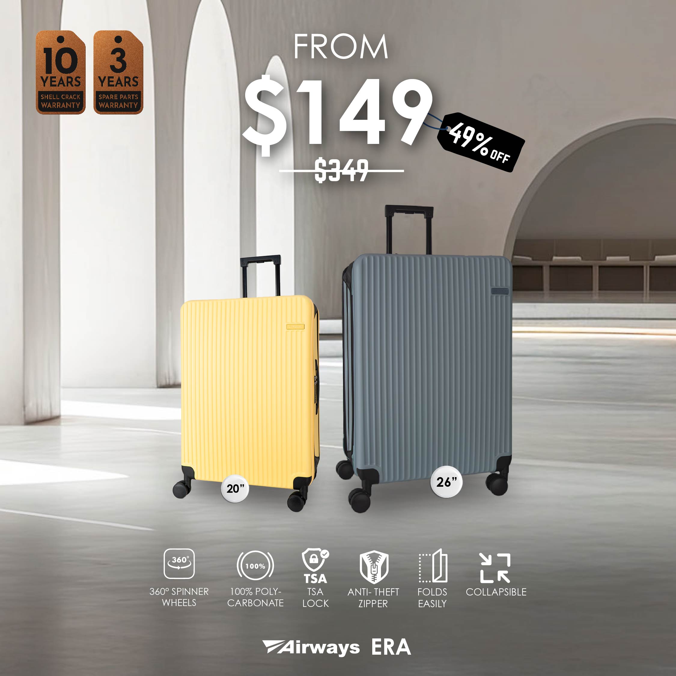 The Airways Era, part of the premium E-Series, offers a world-first collapsible design for easy storage, smooth wheels, and a TSA lock, blending innovative functionality with style for discerning travelers.