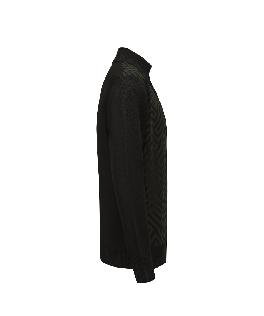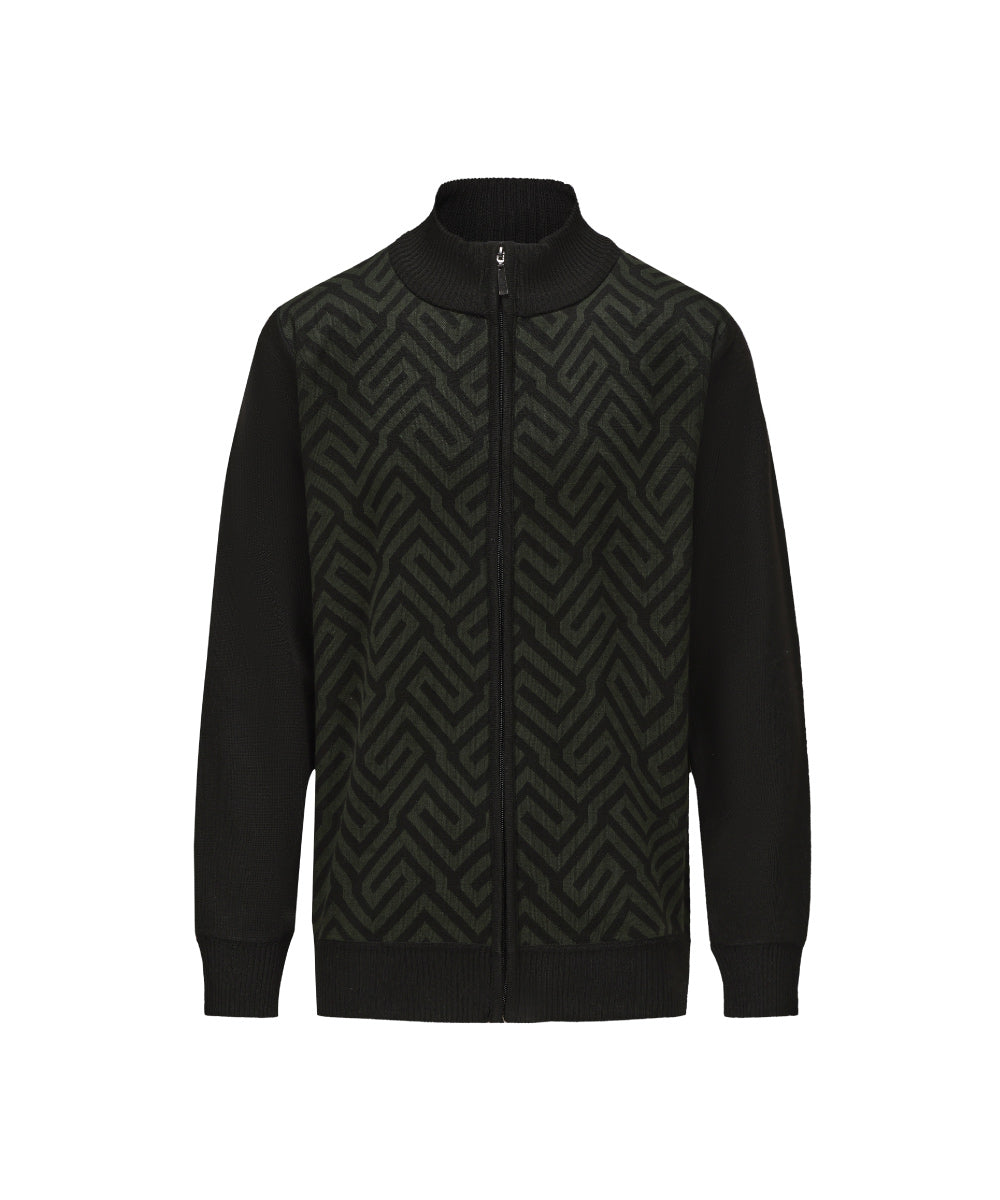 A stylish mock-neck sweater crafted from soft 100% polyester knit. Features an all-over geometric jacquard on the front with solid sleeves and back, plus a stylish mock neck cardigan with full-zip closure. Lightweight yet warm, offering a smartcasual look for cool days.