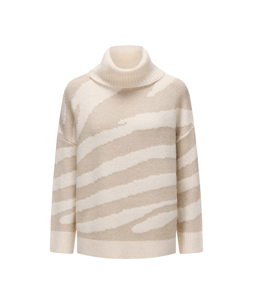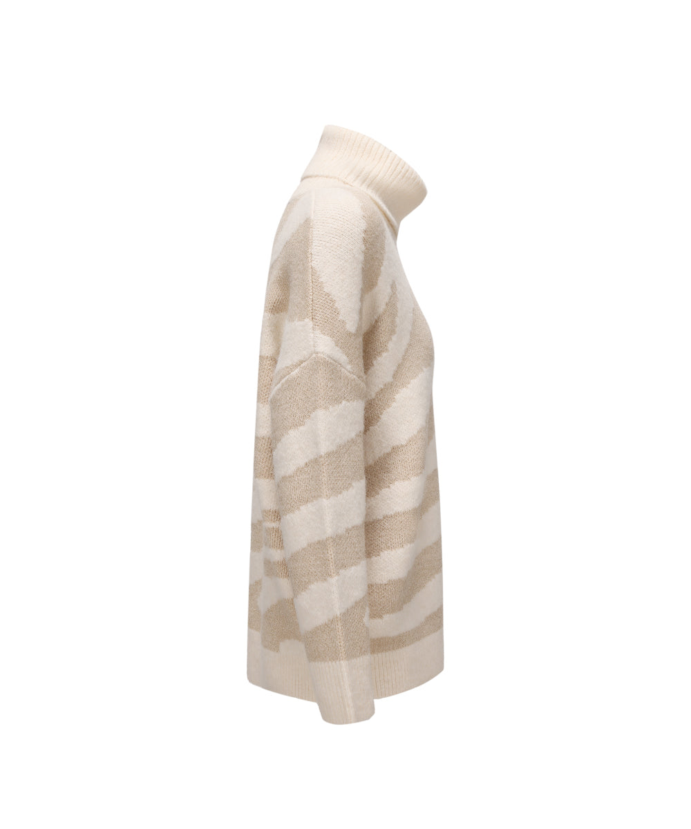 A cozy women’s turtleneck knitted sweater with a soft beige base and shimmering golden lurex stripes. The relaxed fit and chunky knit offer warmth and comfort, while the subtle shine adds a touch of elegance. Perfect for both casual days and dressier winter looks.
