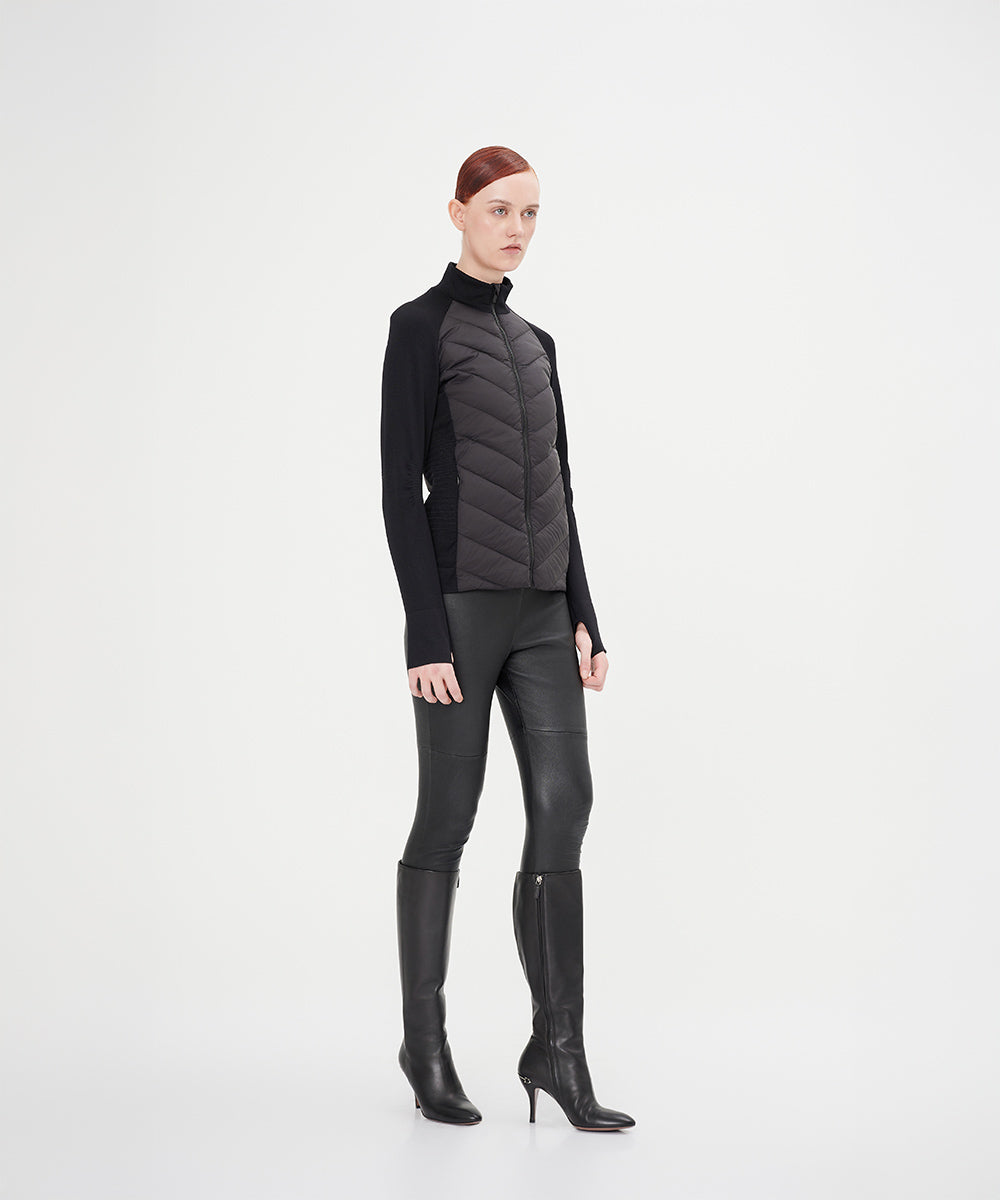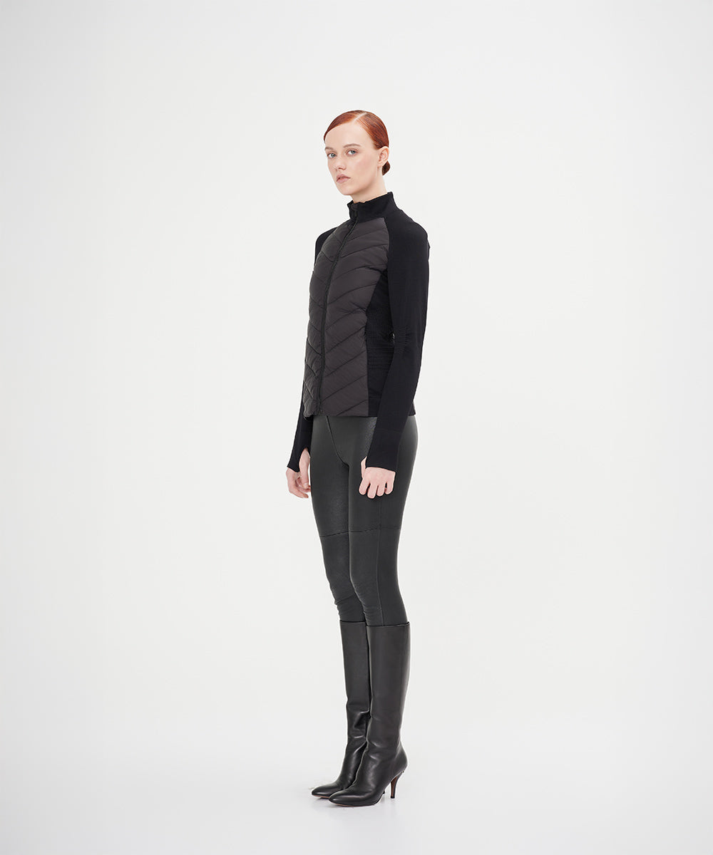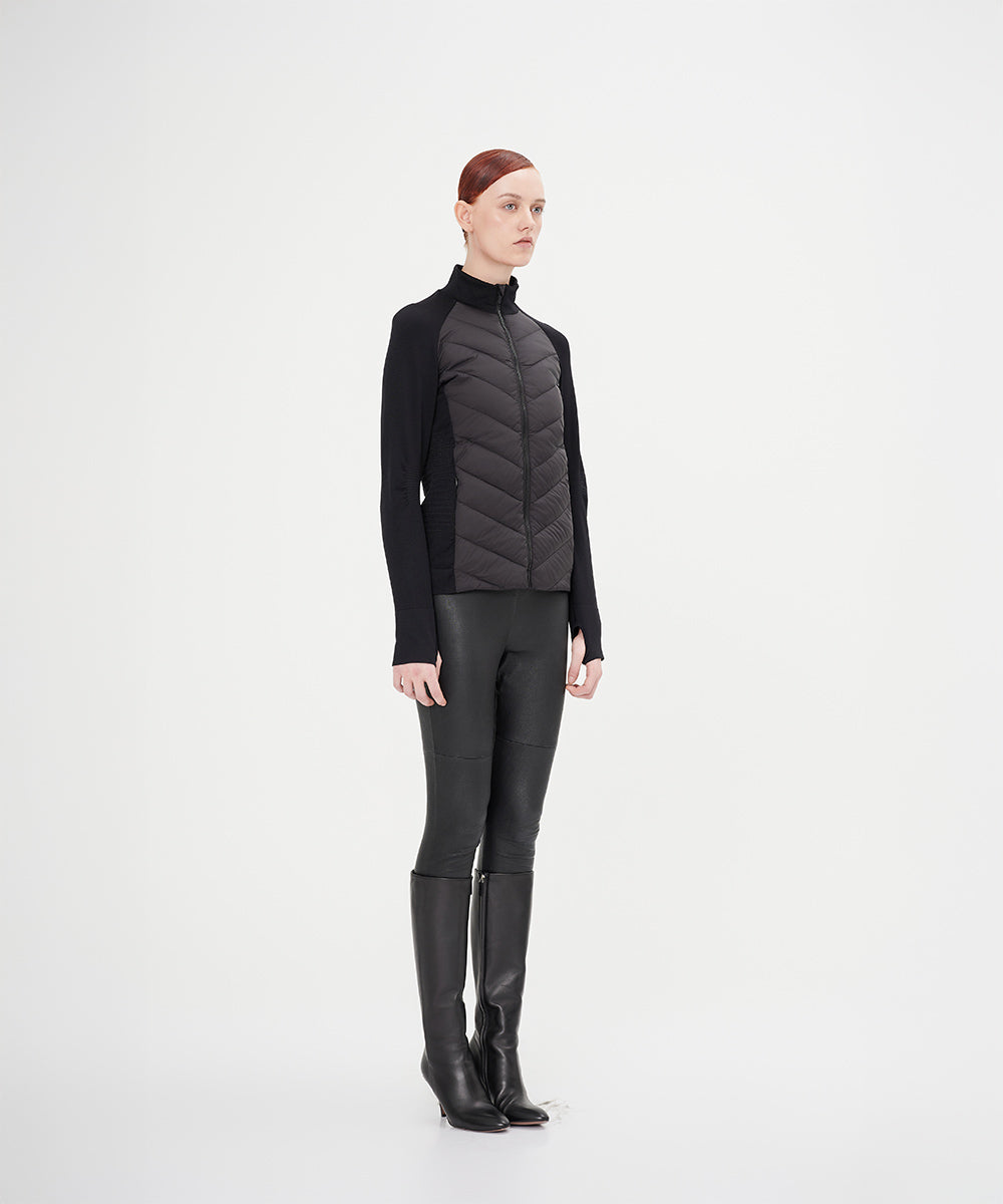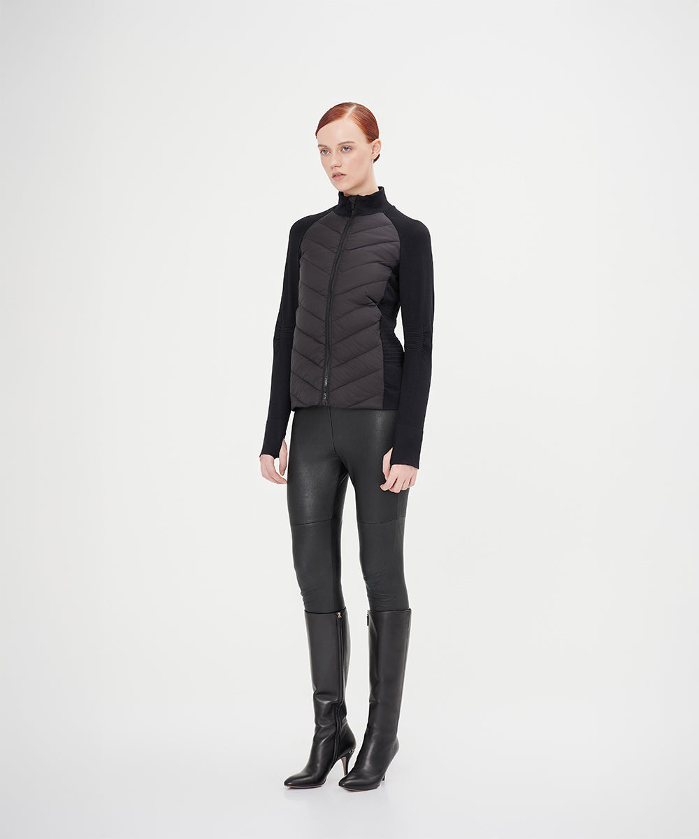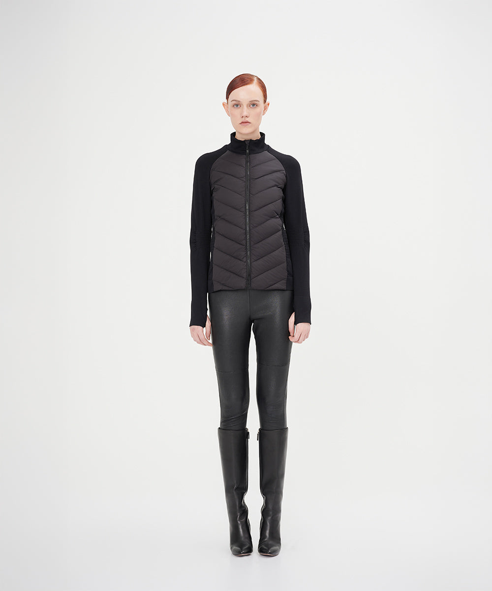 • Knitted jacquard sleeves & side seam, providing an elegant contrast to quilted body, that add both texture and a luxurious touch