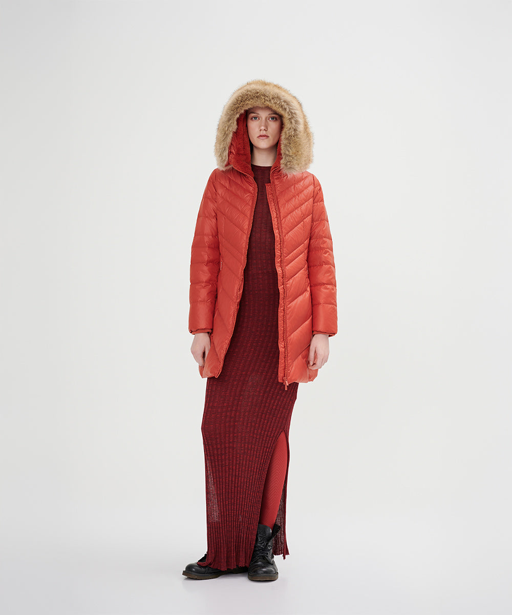 Elegant women's down jacket showcases a refined symmetrical quilting design, creates a balanced, timeless look.